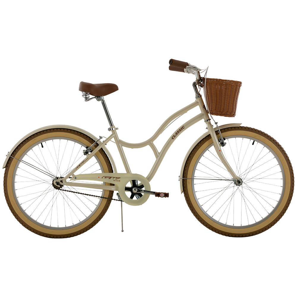 La bicicleta GW Classic 24 combina el estilo playero con la funcionalidad urbana. Su marco en acero y manubrio cromado ofrecen una conducción cómoda y estable, ideal para paseos diarios. El plato en acero y los rines de aluminio garantizan un pedaleo suave y confiable.