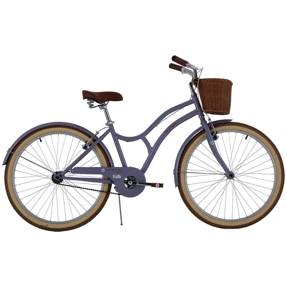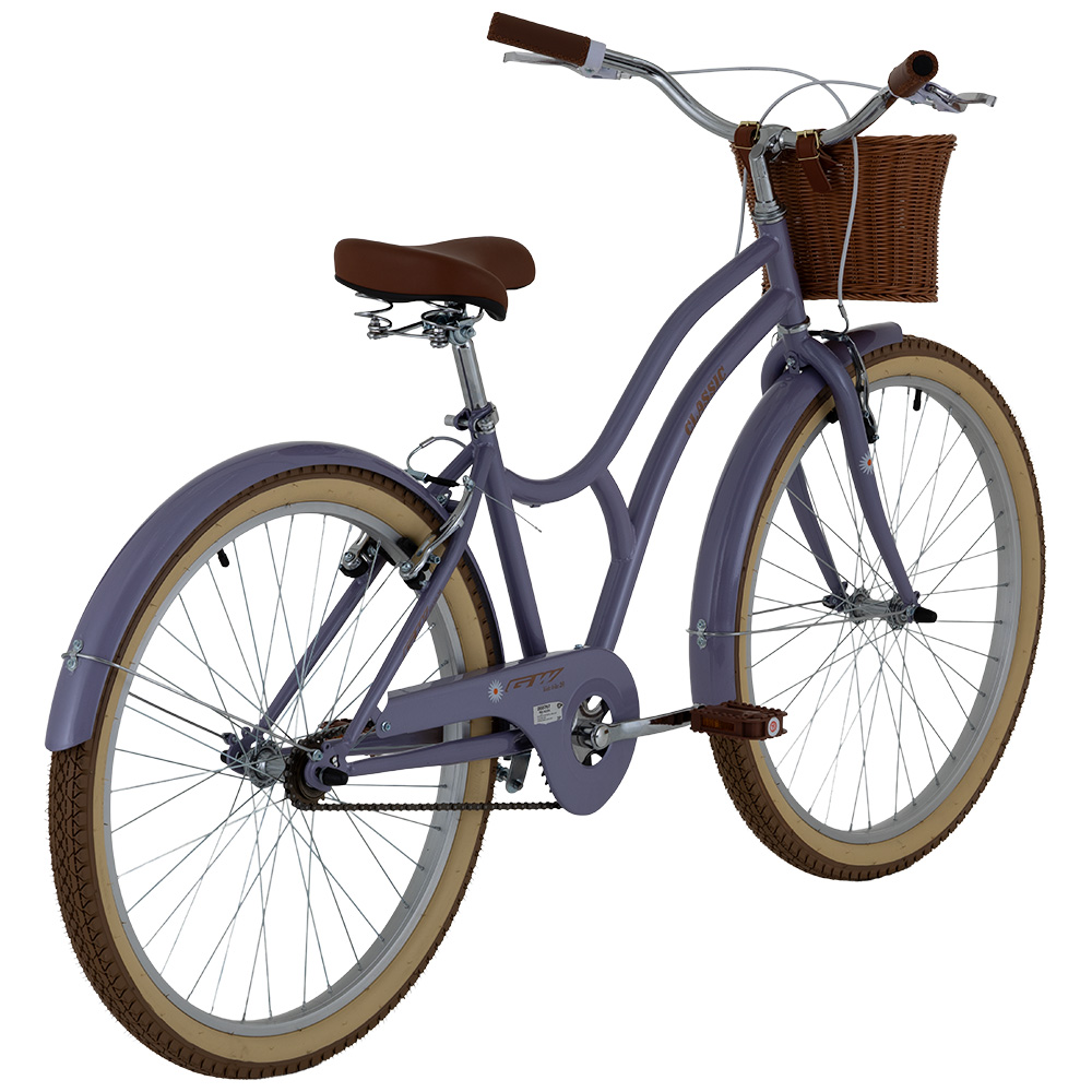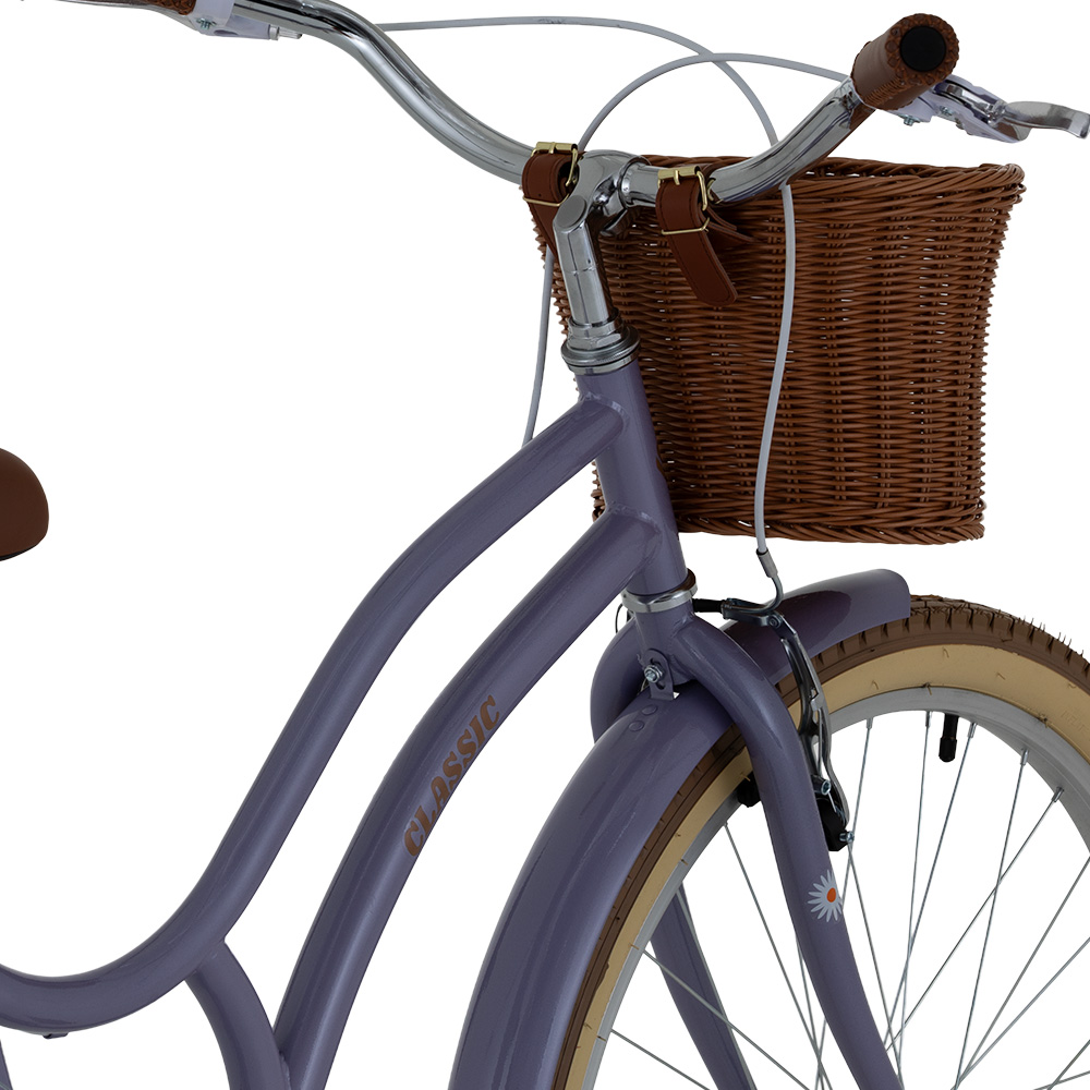 Sus llantas 26 junto con los mangos tipo cuero, los pedales reflectivos y la canasta tipo mimbre, le dan un toque elegante y práctico. Además, cuenta con frenos V-brake en aluminio para una frenada segura y un sillín ajustable para mayor comodidad. Con su llamativo color que le da una personalidad única y perfecta para quienes buscan una bicicleta funcional, estética y con aire vintage.