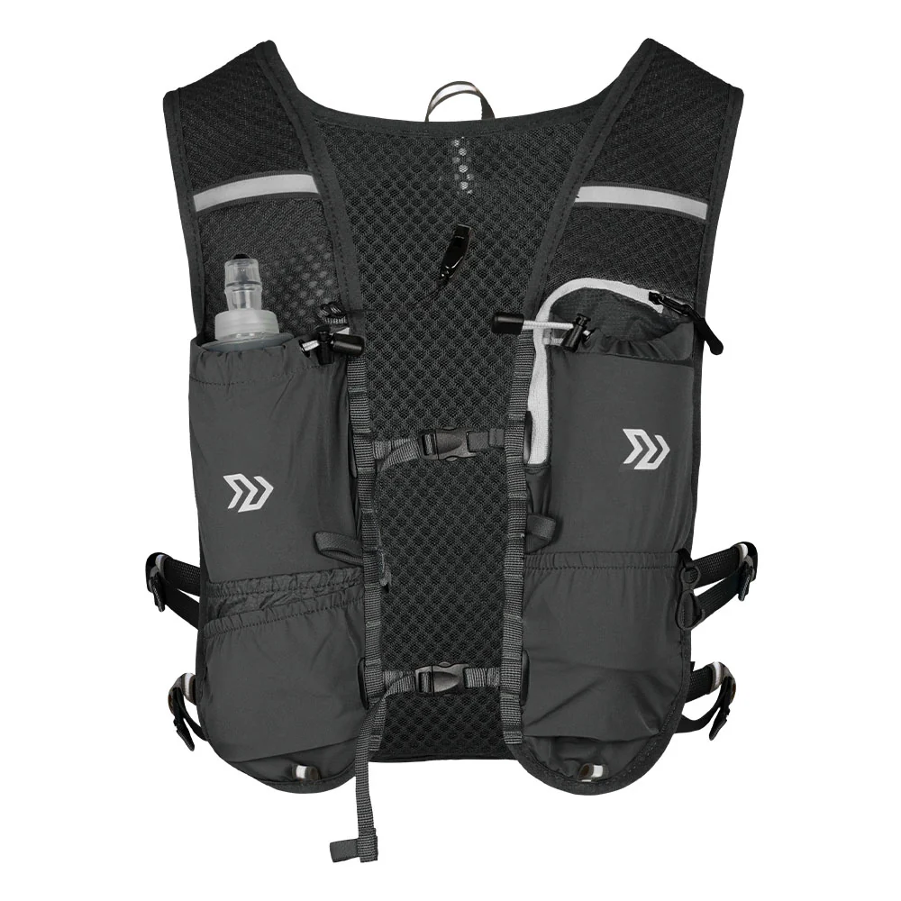 La mochila de hidratación SKY está diseñada para actividades como trail running, senderismo o ciclismo. Ofrece gran comodidad y ventilación gracias a su diseño ergonómico y malla acolchada, que permite libertad de movimiento y reduce el roce. El morral incluye correas ajustables con broche en el pecho y silbato de emergencia, bolsillos frontales y laterales con cierre para botellas o accesorios, además de un compartimento trasero amplio y cordón elástico para sujetar prendas. El chaleco cuenta con detalles reflectivos para mayor visibilidad. No incluye bolsa de hidratación.