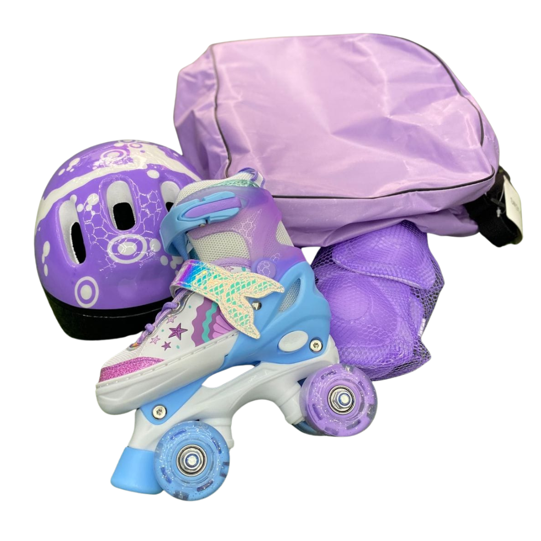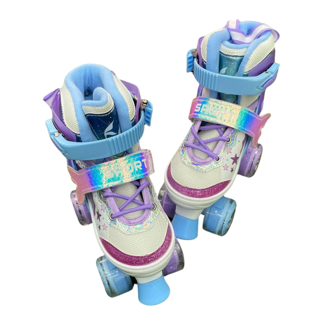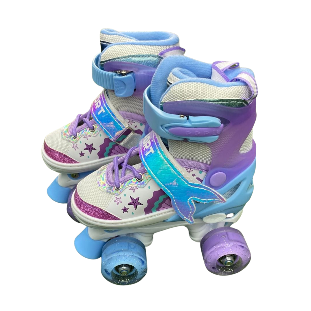 Estos patines ajustables con diseño de sirena han sido creados para ofrecer una experiencia segura, estable y confortable a niñas que inician o practican patinaje recreativo. Su estética inspirada en sirenas incorpora materiales resistentes y detalles de calidad, mientras que las ruedas de silicona con luces LED se activan con el movimiento, brindando mayor visibilidad y un atractivo efecto luminoso.