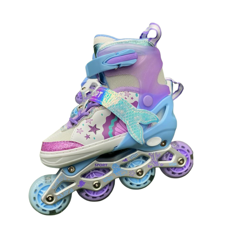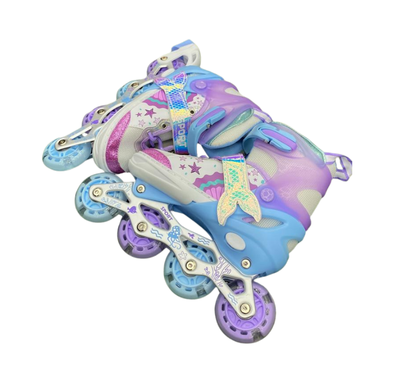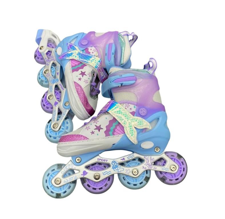 Estos patines ajustables con diseño de sirena han sido creados para ofrecer una experiencia segura, estable y confortable a niñas que inician o practican patinaje recreativo. Su estética inspirada en sirenas incorpora materiales resistentes y detalles de calidad, mientras que las ruedas de silicona con luces LED se activan con el movimiento, brindando mayor visibilidad y un atractivo efecto luminoso.